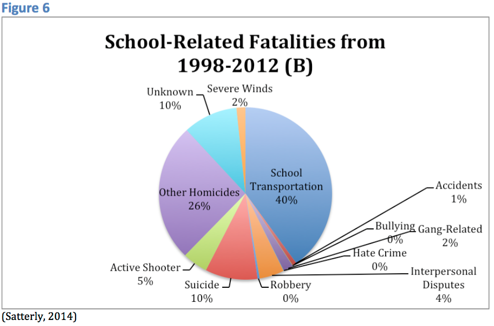 According to the National Highway and Transportation Safety Administration (NHTSA), since 1988 there have been over 416,000 fatal crashes in the United States. 1,265 of these involved school buses, or 0.03%. 1,409 people have died in accidents involving school buses, of which 113 were students (8%). As is seen in the graphic below, 1% of students killed during normal school travel hours were on a school bus, making school buses the safest way to get to school (NHTSA, 2009).