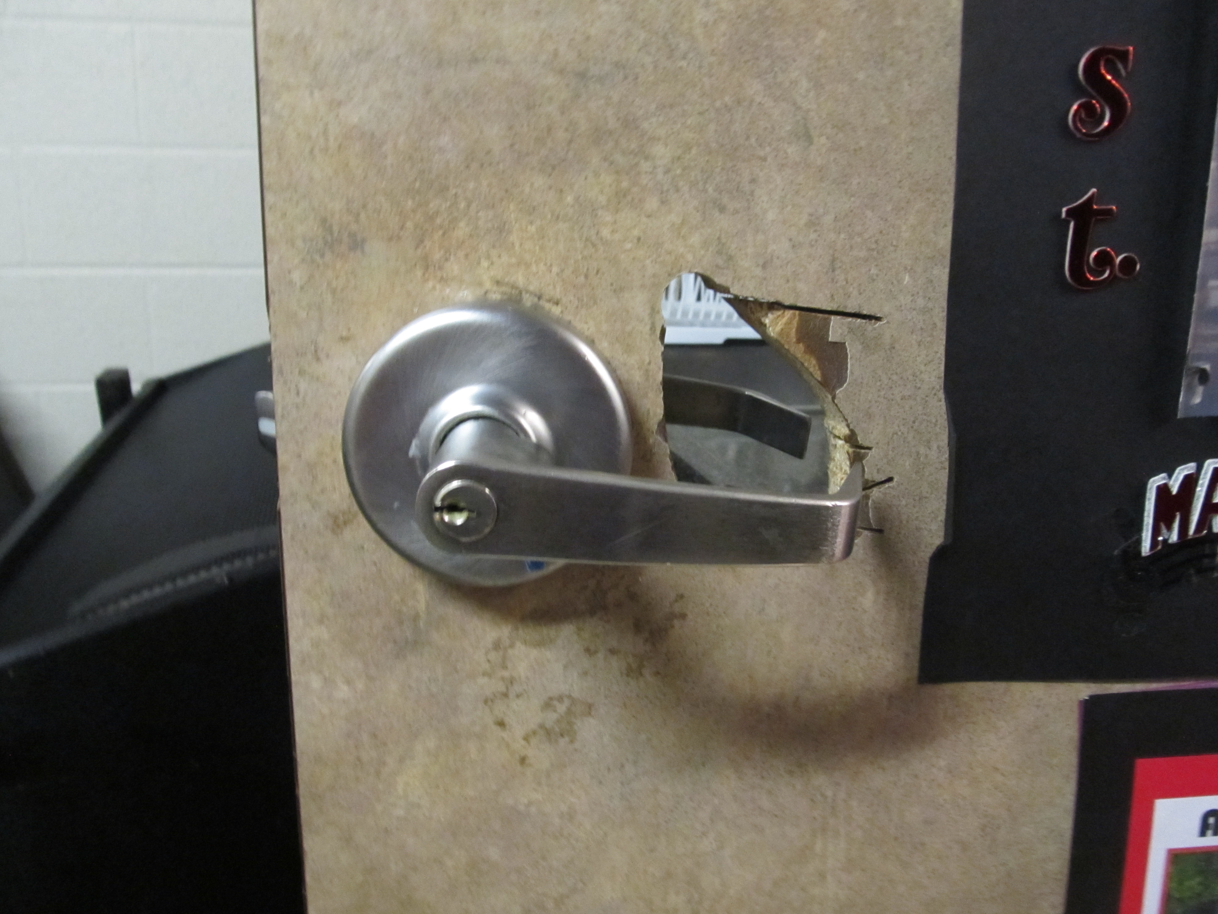 This photo was taken during one of our school hazard and vulnerability assessments. A staff member locked their keys in the band room and cut this hole in the door to unlock the door. This would not only make it easy for someone to steal expensive musical instruments, but makes an excellent safe room easy for an aggressor to enter.